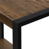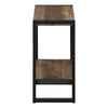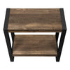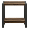 Industrial-farmhouse style combines modern metal with a rustic wood finish to create a warm, inviting look. This two-tier rectangular accent table embodies that popular style. The tabletop and bottom shelf are finished in a brown reclaimed-wood look with naturalistic color variations and a subtle wood-grain texture. Robust metal legs in a black finish provide stability and a striking visual contrast. Finished on all sides, this side table can be positioned in any direction to fit both narrow and wide spaces in a living room or bedroom.