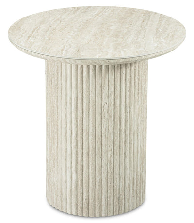 Bring neo-classical design and timeless sophistication to your space with this Sullivan end table. The fluted cylindrical pedestal base in a stone look recalls the elegance of classical columns, making this a stunning statement piece, while the round sintered stone top in a gorgeous beige travertine finish offers durability with its non-porous and easy to clean surface. Uplift the tone of your living room with the Sullivan’s classic aesthetic.