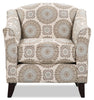 Turn your living space into a comforting and inviting area by adding this refined Tula accent chair. Patterned blue and grey circles cover this off-white piece for a contemporary look you can pair with many different decor options. Plus, matching fabric piping outlines all the edges – including the rolled armrests. The thick seat cushion is packed with high-density foam to give you a cozy place to unwind. With plastic legs finished in a mocha hue, this Tula accent chair will amaze your family and friends with its elegance.