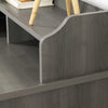 Organize your workspace with office supplies in the two upper drawers and file folders in the bottom one. The three drawers are of varying heights, so items of all sizes can fit… and the small fixed shelf under the work surface can hold your laptop when you’re not using it. The other shelf – at your feet – is intended for books you hardly ever use. Fixed dividers make the under shelf space ideal for storing envelopes and paperwork. The top of the hutch is fully open – great for keeping the things you like to have close at hand as you work. This computer desk is ideal for those who work from home, or as a homework space. The somewhat traditional look, featuring a rounded toe kick and metal handles, will last through the years.