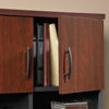 Add a little extra style and a whole lot of extra storage to your office space with this Via hutch. Behind its four doors are hidden storage spaces that provide you with convenient areas to stow away office items that you prefer to be tucked away. It also includes cubbyholes that offer space for smaller office supplies like envelopes and notepads. Plus, the fabric-covered bulletin board makes it easy to hang a calendar, important notes and a few pictures. Finished in classic cherry with a black frame, this hutch will give your space a professional look.
