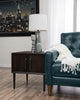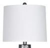 - Beige linen fabric covers the drum shade and complements the shine of the base.